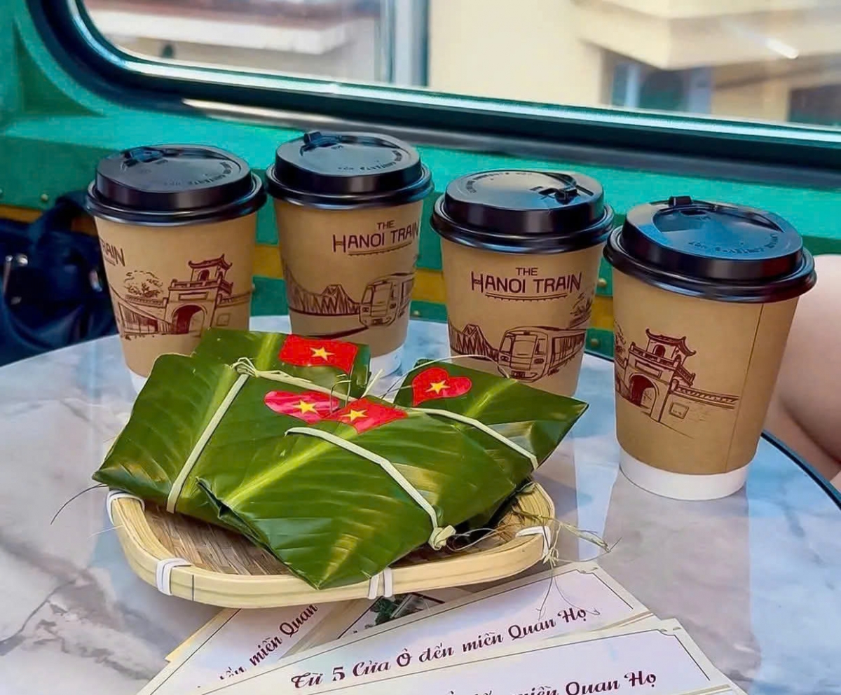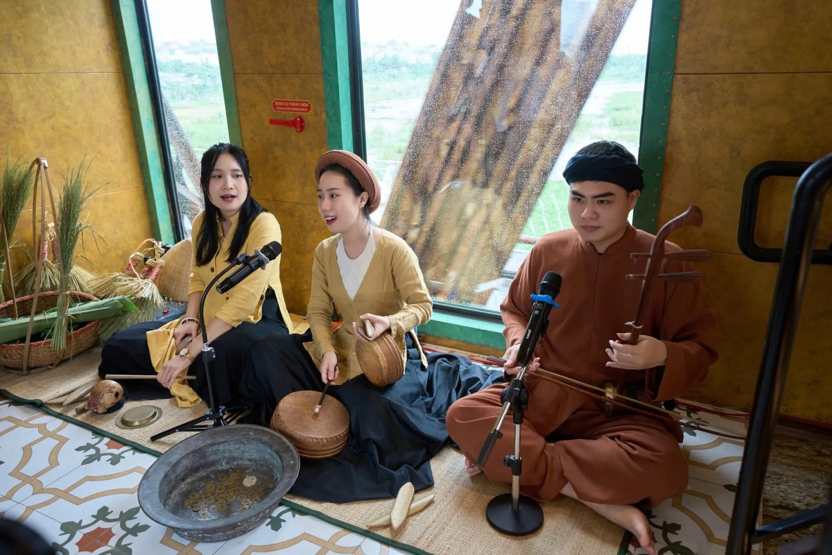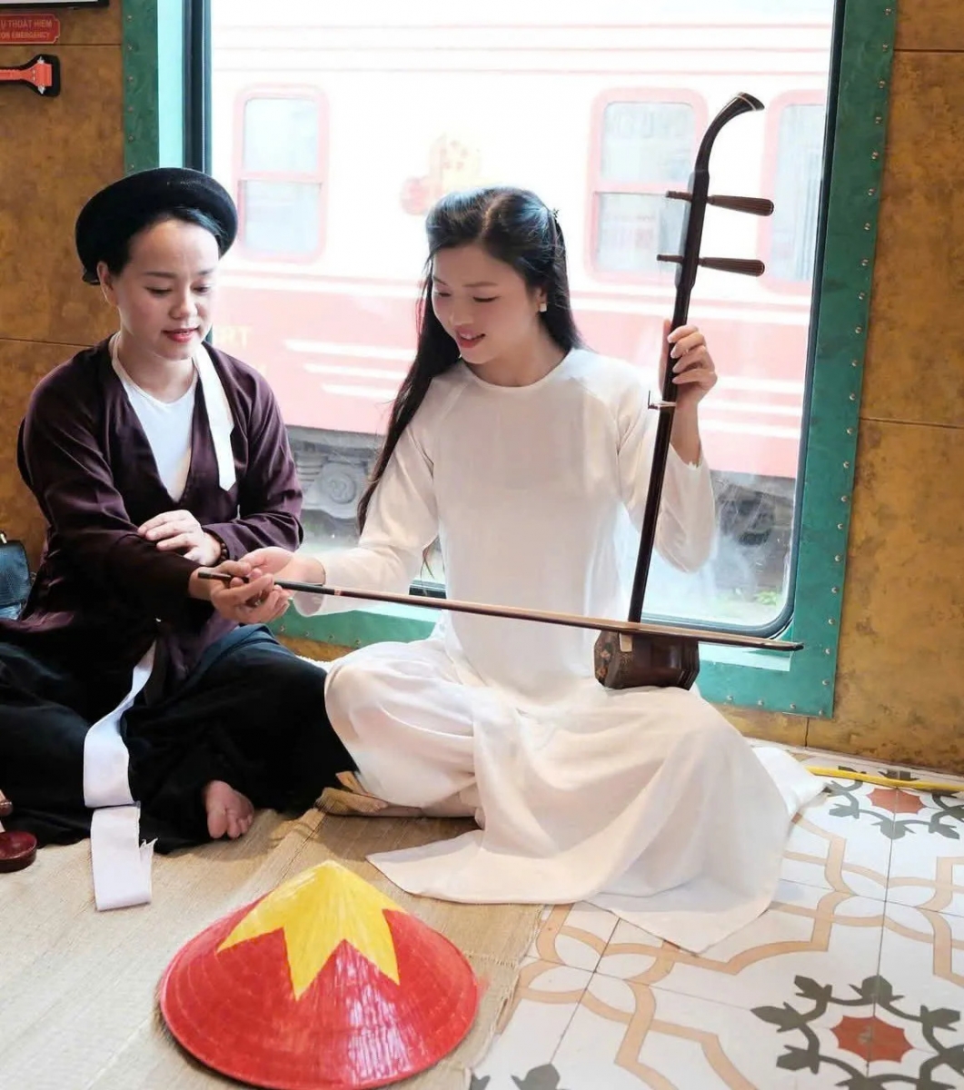Inside the carriages, a vibrant cultural space showcases the soul of Hanoi with traditional arts.